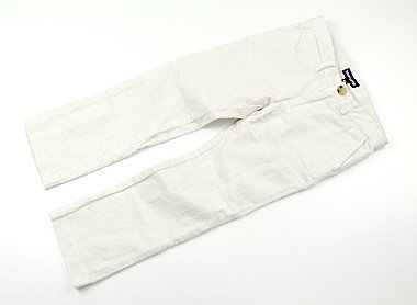 - 細コーデュロイ生地。ストレッチ性のある生地で、サイズ調整ゴムが付いています。全体にごくうっすら黒ずみを感じますが目立つ汚れはなく、まだまだ活躍してくれそうです。