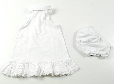 ポロシャツ地のシンプルなワンピース。裾のコットンレースがかわいいです。ブルマ付きで安心。目立った汚れもなく綺麗なお品物です。(記名あり)