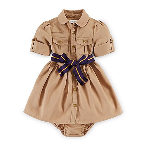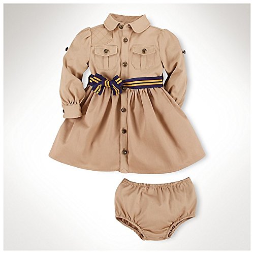 とってもかわいいボタンシャツワンピースが入荷しました。 袖をロールアップして長袖/半袖にすることができます。 ウエストベルト付き。 かわいい~。 上質でしっかり目のコットンチノシャツ素材で、 上品で愛らし1枚です。 同じ素材のブルマ付き。 ラルフローレン人気新作のベビーワンピースです。 出産祝いにも喜ばれます。 ☆素材:綿100% ☆色:ヴィンテージカーキ