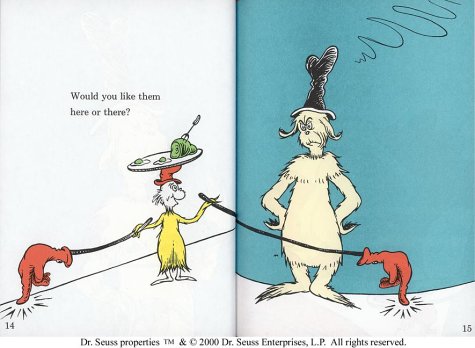 時代を越えて読み継がれる、このスース博士の名作は、1960年に出版されて以来ずっと読者を楽しませてきた。「Sam-I-am」のしつこさといったら、まるで電話でセールスする人のよう。手を変え品を変え、疑り深い主人公に「緑色の卵焼きとハムは絶品だ」ということをわからせようとしている。とにかくあの手この手を使って「新料理」を食べるように勧める。「家の中でネズミさんと」「箱の中でキツネさんと」「ボートの上でヤギさんと、いっしょに食べてみませんか」と勧めるけれどもうまくいかない。ところがとうとう、疲れ知らずの「Sam-I-am」のあまりにしつこさに相手は根負けしてしまう。はたしてお味は?