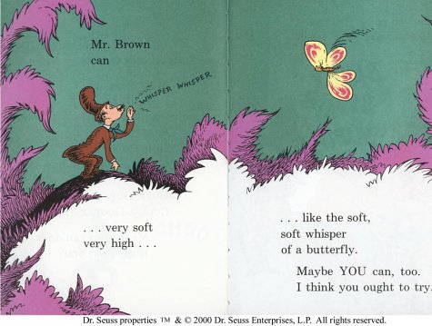 ミスター・ブラウンには、すばらしい特技があります! この「すばらしい音の本」で、ミスター・ブラウンはその特技を披露します。コルクがポンッと抜ける音(pop pop)や馬の蹄の音(klopp klopp)も真似してしまうミスター・ブラウン。もちろん、読者も音真似を気軽に楽しめます。いろいろな音や文字を学んでいる最中の小さな読者たちも、まじめな顔をしたミスター・ブラウンの真似をするだけで、練習が可能。フライパンで卵が焼ける音(sizzle sizzle)だろうが、カバがガムを噛んでいる音(grum grum )だろうが、ミスター・ブラウンの手にかかればお手のもの。「Mr. Brown is so smart he can even do this: he can even make a noise like a goldfish kiss! ...pip! (ミスター・ブラウンはとても賢いので、こんなこともできます。金魚のキッスの音だって真似ができちゃうんですよ!…ピチュッ!)」毎度のことながら、ドクター・スースの絵本は文も絵も魅力的。読まずには(そしてゆかいな音を立ててみずには)いられません。読みながら笑わずにいられない『Mr. Brown Can Moo! Can You?』。何度読んでも飽きないことは間違いなし。(Paul Hughes, Amazon.com)