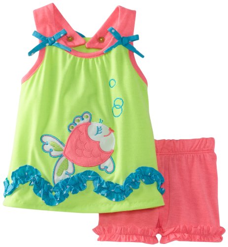 ライムグリーンで飾られたトップブルー/ホワイト水玉フリルと小さなリボンのストラップと魚は前面にアップリケ。フクシアショーツとのや裾は、[設定]をクリックします。