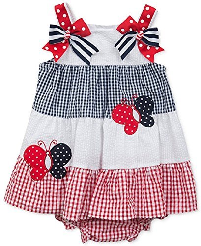 赤、白、青--と蝶この愛国的な優美なドレスからRare Editionsは次のようなコーディネートおむつカバーが女の赤ちゃんは、祭りの準備。スクエアネックで装飾性のある小さなストラップ、ノースリーブ、バックボタン付きおむつカバーを閉じ交互による安定した色相とcheck-printバタフライアップリケ前面にポリエステル/コットン洗濯機洗い可能