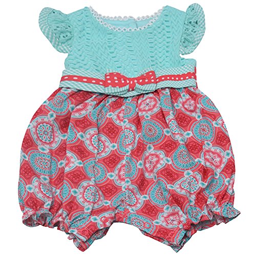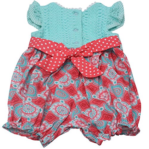 カウントされてかわいいデイジーのロンパース女の子赤ちゃんのためだ。の上部ミントかぎ針編みを、万華鏡印刷ボトムウエストに、リボンのアクセントは、このジャンプスーツを着て、また彼女のワードローブに必須のアイテムです。レッドに白い点線tieサッシバックすることはできません。