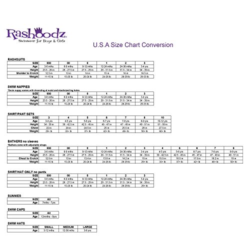 - rashoodz rashoodzサイズ表製品はすべてアメリカとオーストラリア;サイズ00 6 – 9ヶ月、9 – 12ヶ月サイズ0、サイズ1のサイズ12 – 24ヶ月、サイズ2 2t 24 – 36ヶ月。男の子と女の子のrashoodz水着の範囲は6か月熟成には、3年には適用されません。また、女の子の水着ワンピース水着)の範囲では最大サイズ8。