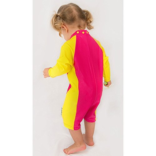 rashoodz紺とライムグリーンまたはホットピンクとイエローのワンピーススーツラッシュガード男の子と女の子の赤ちゃん、赤ちゃんの各ベビーの水着は、高品質の塩素耐性UPF 50 +の生地から作られていますベビースイムウェアは長袖、前面にファスナーが付いています。脚の間にスナップを簡単なドレッシングと変化しています。