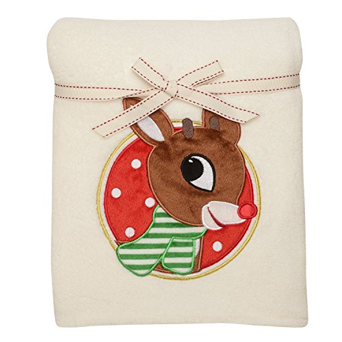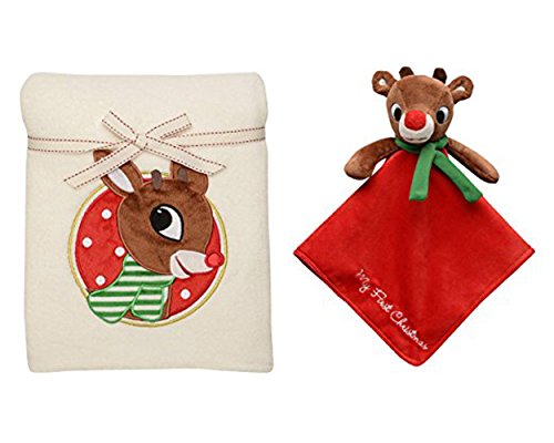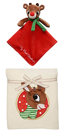 This Classic Character - Rudolf the Red Nosed Reindeer set makes a sweet Holiday Keepsake.;Enjoy two items in one package: Set includes one Rudolf Nursery Blanket 30 x 40 and one Rudolf My First Christmas security rattle head toy.;Rudolph toy measures approximately 3 x 3 x 3.5 (excluding arms) and attached snuggy is soft fleece on the outside & satin on the inside & measures about 15 x 14 open;Both blanket and toy are child safe and suitable for newborn. Features and My first Christmas are embroidered for soft touchable details.;Both blanket and toy are 100% polyester. Machine washable cold, tumble dry low. Do not bleach.