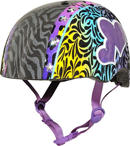 Live on the wild side with Raskullz Sparklez Wild Gurrlz helmet. Black and silver glitter fabric, silver stars applique, teardrop flocking, colorful leopard print and hologram rainbow hearts. This helmet has it all.