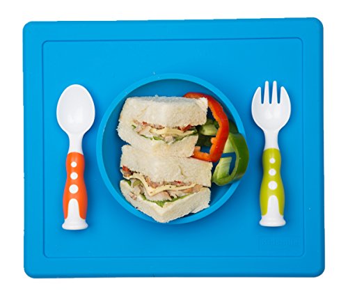 Raymoon 子供用 食器 お食事マット 一体式 ハッピボウル ランチョンマット ランチプレート シリコン 離乳食 ベビー食器 赤ちゃん 防水 滑り止め 可愛い 出産祝い スプーン フォーク付き ブルー