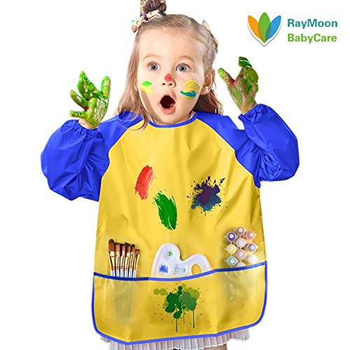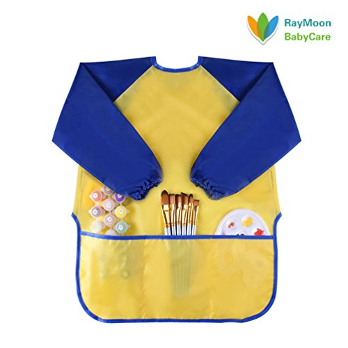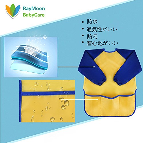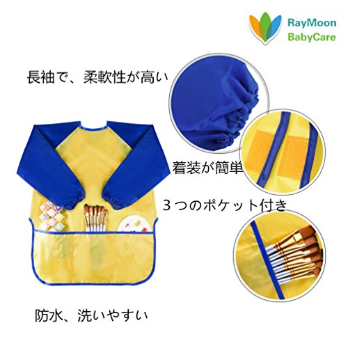 Raymoon 子供用 ポケット付きエプロン ナイロン ポリエステル製 シンプル 絵画用 食事用 スモック 防水 長袖 保育園