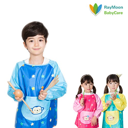 Raymoon おしゃれ 子供用 絵画 食事エプロン ポリエステル 長袖 保育園 防水 防汚 ブルー