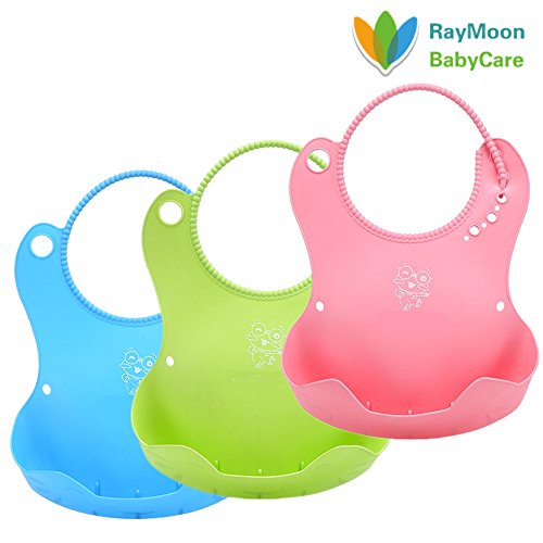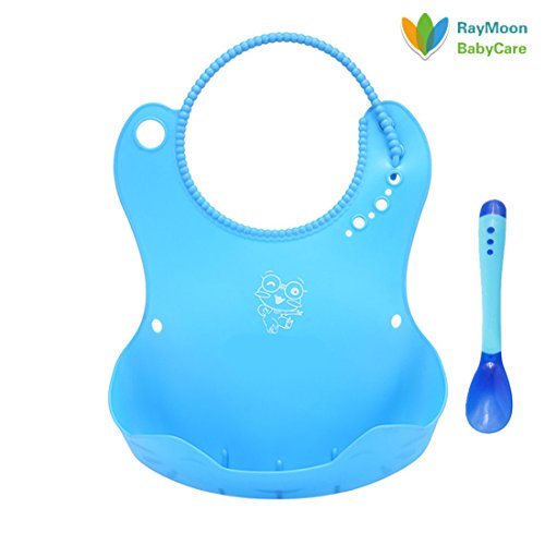 Raymoon 食事用 可愛い 防水 エプロン ベビーソフトスタイ シリコン 大きいポケット付き 軽くて柔らかい 食事こぼしキャッチ 持ち運び便利 贈り物 出産祝い 洗いやすい キャラクター ブルー