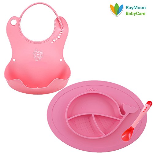 Raymoon ベビー 食事用 シリコン 防水 エプロン 食器 大きいポケット付き 軽量 可愛い動物柄 持ち運び便利 誕生日 プレゼント 出産祝い 前掛け 袖なし 食事こぼしキャッチ 断熱 洗いやすい フォーク スプーン付き
