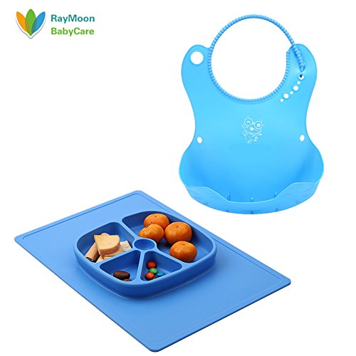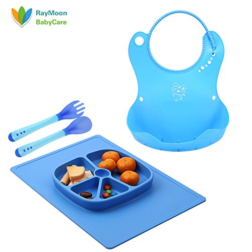 Raymoon ベビー用 食事用 防水 エプロン 食器 シリコン製 大きいポケット付き 軽くて柔らかい 可愛い図案付き 食事こぼしキャッチ 持ち運び便利 プレゼント 出産祝い 洗いやすい フォーク スプーン付き