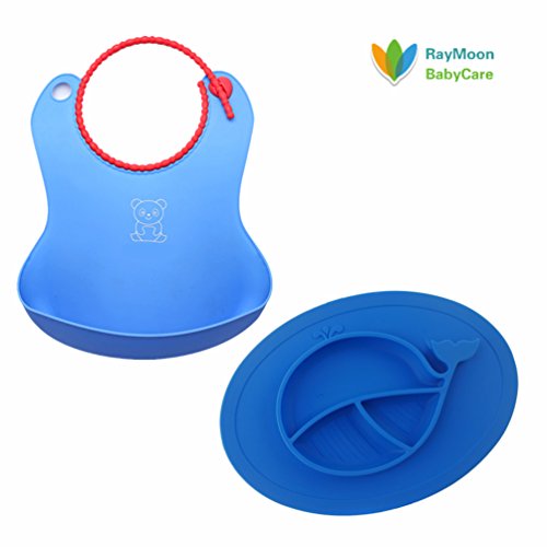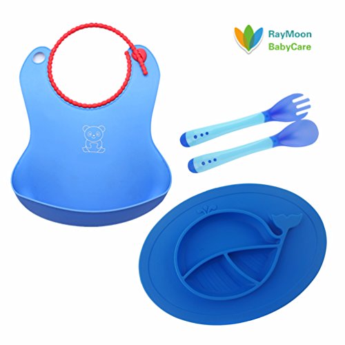 Raymoon ベビー 食事用 シリコン 防水 離乳食 エプロン 食器 キッズ 大きいポケット付き 軽くて柔らかい 可愛い動物柄 食事こぼしキャッチ 持ち運び便利 誕生日 プレゼント 出産祝い 洗濯可 前掛け 袖なし フォーク スプーン付き