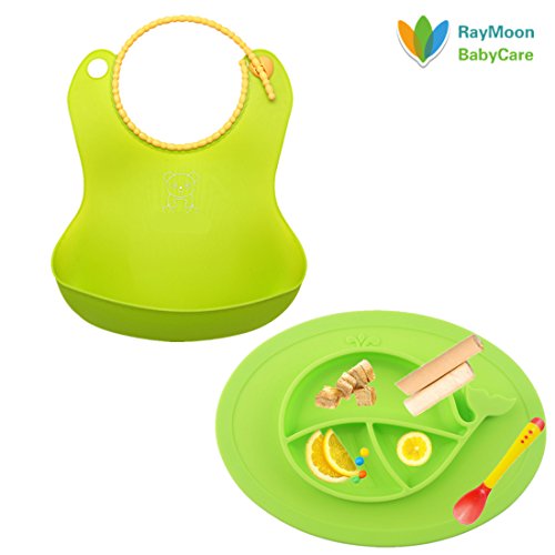 すべりにくいシリコーン製の食器と食事が楽しくなってきたお子さんにぴったりで、食べこぼしもしっかりキャッチできるお食事スモックと完璧に組み合わせます。