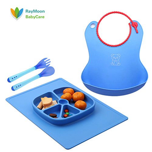 Raymoon ベビー お食事用 防水 エプロン 食器 シリコン製 大きいポケット付き ソフトスタイ 可愛い動物柄 食事こぼしキャッチ 持ち運び便利 プレゼント 出産祝い 洗濯可 お手入れ簡単 フォーク スプーン付き