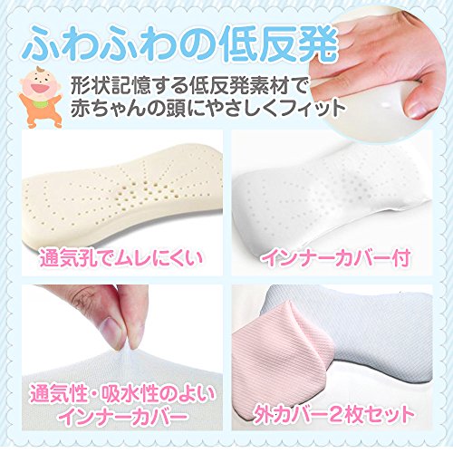 - 【ふわふわの低反発】低反発素材。形状記憶するので赤ちゃんの頭にやさしくフィットします。通気孔が空いているのでムレにくく、インナーカバーも通気性のよい素材を使用。外カバーは取外し可能で清潔に保てます。外カバーはピンク、ブルーの2色付。