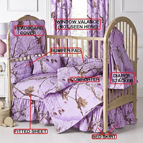 Realtree AP Camo Lavender 7 pc. Baby Crib Set - Gift Set Save By Bundling!;Set includes, one fitted sheet, headboard cover, bumper pad, comforter, bed skirt, diaper stacker & window valance;Easy Care machine wash warm;Quality stitched, comfortable & durable;A baby girls camo baby bedding collection bedding in lavender and brown, the All Purpose Lavender bedding ensemble lends a fun and girly appeal to any outdoor inspired nursery decor.