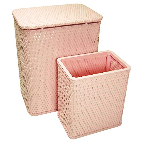 Crystal Pink Two Piece Set includes a Nursery Hamper and matching wastebasket nested together for easy shipping Superior quality and construction Removable inside vinyl bag is great for soiled clothing and is easily wiped clean Double hinged wicker lid High gloss enamel paint that will last for years to come 1 year limited warrantyMaterials: woven material, high impact polystyreneColor: Crystal PinkProduct Height: 18.5Product Width: 14.25Product Depth: 10.25