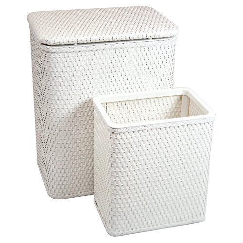 White Two Piece Set includes a Nursery Hamper and matching wastebasket nested together for easy shipping Superior quality and construction Removable inside vinyl bag is great for soiled clothing and is easily wiped clean Double hinged wicker lid High gloss enamel paint that will last for years to come 1 year limited warrantyMaterials: woven material, high impact polystyreneColor: WhiteProduct Height: 18.5Product Width: 14.25Product Depth: 10.25