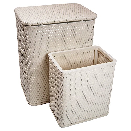 Cream Two Piece Set includes a Nursery Hamper and matching wastebasket nested together for easy shipping Superior quality and construction Removable inside vinyl bag is great for soiled clothing and is easily wiped clean Double hinged wicker lid High gloss enamel paint that will last for years to come 1 year limited warrantyMaterials: woven material, high impact polystyreneColor: CreamProduct Height: 18.5Product Width: 14.25Product Depth: 10.25