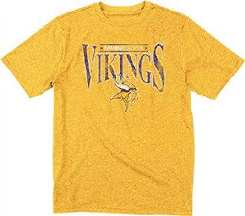 Minnesota Vikings着ながら、過去を祝うこの快適なスーパーソフト50 / 50コットン/ポリシャツで提供されるゴールドヘザーと本体はルーズフィットでは、たくさんの部屋に移動を指定する場合に使用します。バイキングNostalgic半袖レトロシャツretro-sportsのジョックタグ左下裾とスクリーンを適用しfull-chest Distressedチームは、ヴィンテージのグラフィックが胸にステッチが特長です。
