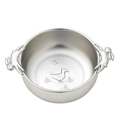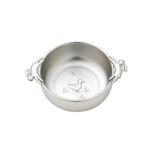 The charming Quilted Rabbit Bowl by Reed & Barton sports two long-eared rabbits running around the rim, creating two very convenient handles. Baby will eagerly finish dinner to uncover a duckling and butterfly quilted on the bottom. Crafted in non-tarnish pewter in a tumbled vintage finish, this engravable bowl will make mealtimes fun. Handcrafted in America. Elegantly packaged for gift-giving. Part of the Quilted Rabbit Collection.
