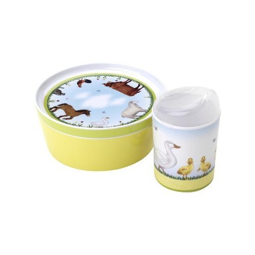 The delightful farmyard friends mealtime set from Williamsburg by Reed & Barton is crafted in child friendly melamine. It includes a spill-resistant sunny yellow bowl with a baby lamb inside, an apple green plate with a circle of animals, and a Sippy cup featuring mama duck and ducklings. Plate doubles as a cover for the bowl to keep food warm. Baby can learn the names and sounds of the animals in between bites. Elegantly packaged for gift-giving. Part of the farmyard friends collection.
