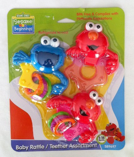 Sesame beginnings 3 piece teether/rattle, Fun sesame beginnings characters, Bpa and phthalates free, Color or pattern may vary from picture shown, For babies 1-18 months old