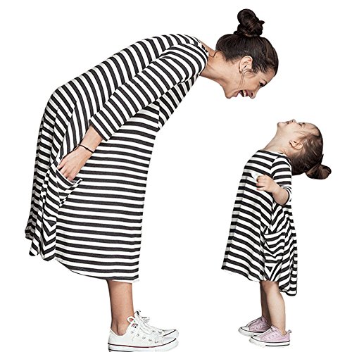 Remeehi 親子 オソロ服 縞模様 子供服 キッズ ワンピース 女の子 ママ ワンピ ファション 七分袖 長袖 ポケット付き 春夏 子供用
