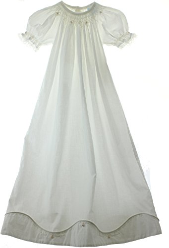 美しい女の子の洗礼洗礼ガウンのパフ袖、ビショップは短いスタイルスモックホワイトで刺繍された花と刺繍されたデザイン上の裾。は、スリップ100コットンサイズは幅約30インチの長