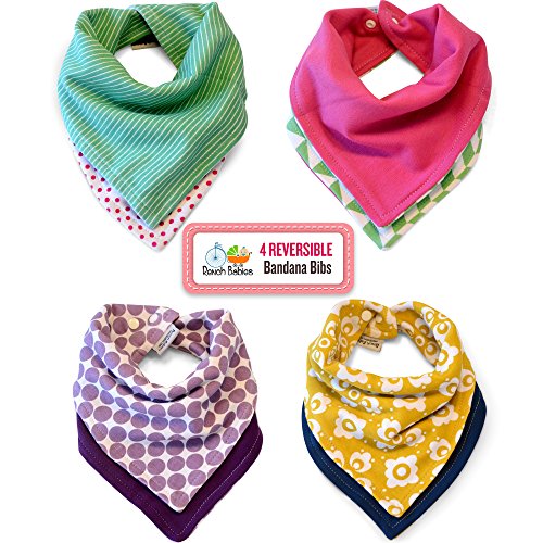 BEST VALUE: You will definitely get more than your money's worth. Get 8 different styles from 4 exceptional quality baby bandana! These bandana bibs for babies are built to last and is backed with a 100% MONEY BACK GUARANTEE.;ECO-FRIENDLY: Meaning, if you have a stain/wetness on the front of the baby bandana bib, don't reach for the detergent just yet, flip it around and rock another look. These dribble bibs are made with soft, heavy duty, 100% premium cotton that will keep your baby completely dry.;TRAVEL LIGHT: Packing and traveling is a breeze because you can match your baby outfit with this reversible baby scarf bib that can be transformed into a different look in seconds. Of course your baby will be getting tons of compliments and envious glances from people around.;GREAT FOR SENSITIVE SKIN: Because it is so much softer, babies with sensitive skin tolerate 100% cotton better. Our baby bandana bibs are made to handle/absorb more wetness, keeping your baby dry for longer periods.;UNIQUE BABY GIFT SET: Our 4-pack of scarf bibs for babies can make a lasting impression as baby showers, birthday gift, or a gift for most special occasions and Christmas present. It will be a hit and will not be forgotten.
