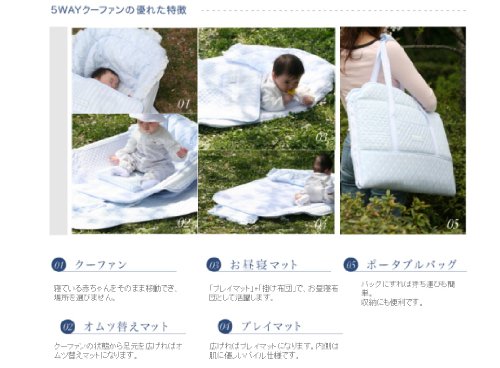 「ランデブー5WAYクーファン」は、クーファンとしてはもちろん、プレイマット、オムツ替え、お昼寝マット、さらにはバッグとしても使えます。