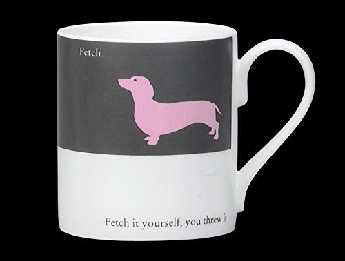 Fantastic Contemporary Bone China Mug;Grey background with pink Dachshund & caption;Fetch... Fetch it yourself, you threw it.;Height: approx 84mm, Capacity: 250ml;Decorated in Stoke-on-Trent England using traditional techniques
