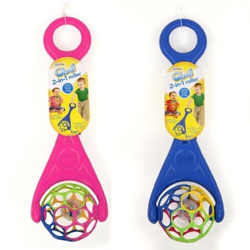 Shaking, rattling, and rolling fun - The Oball Roller! Inquisitive little kids find the Oball Roller lasting fun! A clever toy of impressive design. In the beginning, little children grab, shake, and throw Oball in enthusiastic play. Before long, they're interested in the push handle and making Oball rattle and roll as they push it along the floor. A rattling ball is home inside a smooth and flexible Oball - which attaches neatly onto a plastic frame for easy pushing. Rhino Toys Oball Roller Rattling ball inside a flexible Oball with push handle frame For sensory awareness, fine motor skills, gross motor skills Sure entertainment - excites babies, toddlers & beginning walkers! Makes delightful noise as it rolls along Finger-holes for easy grabbing & holding Remove handle for a simple ball & rattle combo Attach the plastic handle for push toy variation Oball Diameter: 6 inches; smaller rattle ball inside Handle attached: 8 x 24 x 6 inches Free of PVC, Latex & Phthalates Dishwasher safe