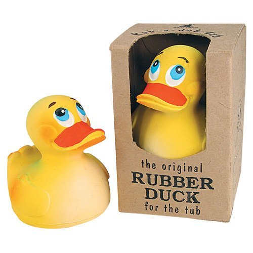 A blast from the past for your bath! Retro rubber duck is made of natural latex and handpainted with natural-dye paints. Fun stocking stuffer or retro gift for the collector. 3.5" tall.