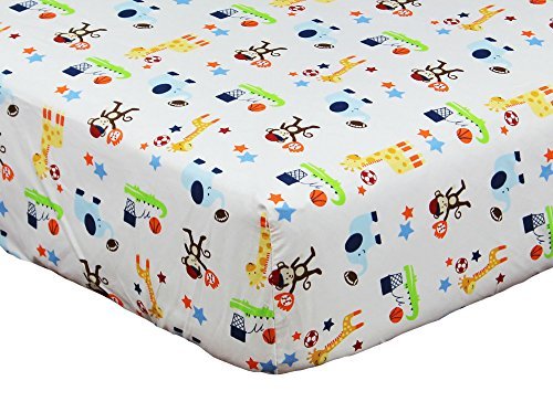 200 thread count 100% cotton fitted crib sheet;All-around elastic assures a safe and secure fit with a standard 28 by 52 inch crib mattress;Features a variety of jungle animals playing their favorite sports;Coordinates with the Ready Set Go Crib Bedding Set by Riegel