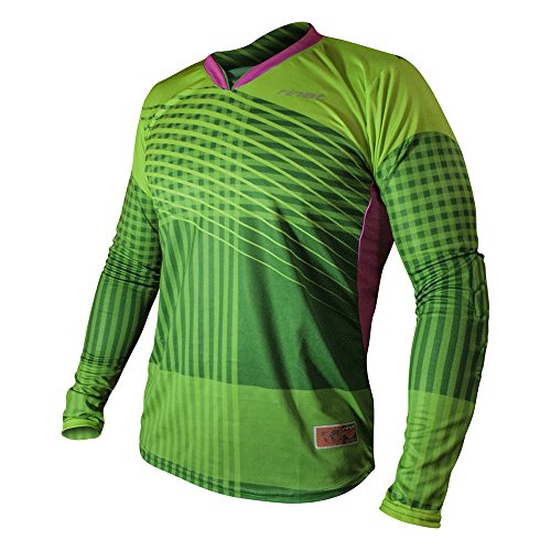 rinatゴールキーパージャージ通気性の高いポリエステル生地で作られ、の新鮮を保ち内側を備えています。これらの衣服の繊維が処理されて肌を保護太陽の光線の原因の有害な影響を削減し、特定の露出することはできません。昇華型でデザインおよび製造プロセスのフロントと袖、通気性のために、側面にメッシュパネルから熱をとります。正面の異なるファブリック、背中と腕の組合せです。ラウンドネックライクラで終了するには入力のヘッドが表示される。プリントロゴが付いています。保護で肘と前腕です。