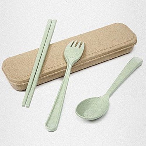 小麦Strawポータブル再利用可能な3個食器セット旅行Wheat Strawテーブルウェアカトラリーe2s Green グリーン