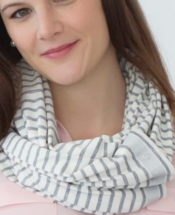 Nuroo(ニュールー)授乳ケープはオシャレなスカーフ やストールのように着こなしがアレンジできる、画期的な授乳ケープです。いろいろな授乳ケープが発売されていますが、それらは単なる「授乳ケープ」であり、授乳ケープにもなる「おしゃれアイテム」はニュールー以外類を見ません。様々な場面であなた独自のアレンジを可能にする秘密はケープのふちに配列したいるスナップボタンです。このボタンを付け替えることにより様々な形にアレンジできます。