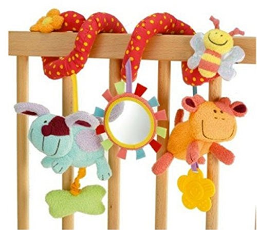 - ベビーカーやベビーベッド用おもちゃ。赤の牛ガラガラに歯がため付き、太陽さんベビーミラー、青のワンちゃんの頭を押すと「ビー」と音がなる、緑の枕を引っ張って...赤ちゃんの興味を引くことができる
