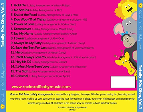 Rock N' Roll Baby music's totally 90's diva takes your favorite female anthems of the 90's and makes them into lullabies your baby will love. This volume includes classics by Mariah carey, TLC, Wilson Philips and many more.