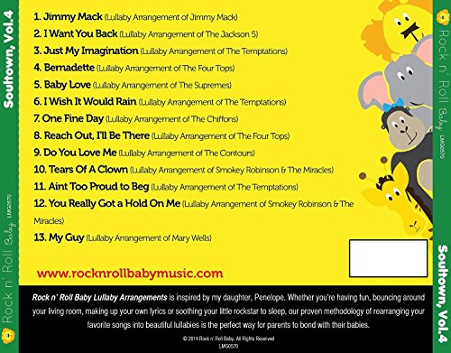 Rock N' Roll Baby music's soultown collection takes your favorite Motown hits from the 50s, 60s and 70s and makes them into beautiful lullaby arrangements for your baby. This first volume includes classic songs by chuck berry, Marvin gaye, frankie lymon and many more.