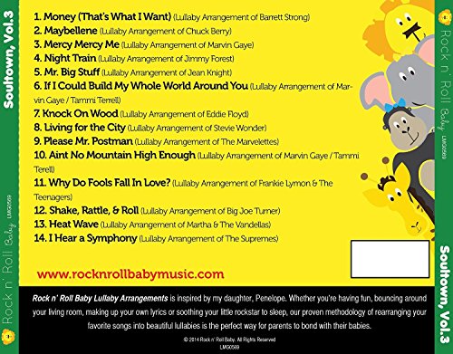 Rock N' Roll Baby music's soultown collection takes your favorite Motown hits from the 50s, 60s and 70s and makes them into beautiful lullaby arrangements for your baby. This first volume includes classic songs by chuck berry, Marvin gaye, frankie lymon and many more.