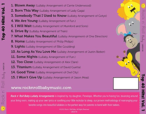 Rock N' Roll Baby music's top 40 hits brings you a collection of your favorite contemporary pop artists in the form of adorable baby lullabies. Artists include Justin Bieber, Carrie Underwood, Lady Gaga and much more.