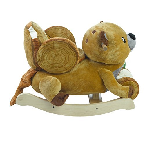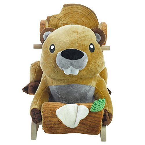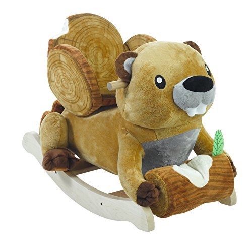 Tell everyone in the forest.Rockabye's new Critters woodland animal collection is finally here. When he is not building a log dam, Buckee the Beaver loves to rock! Buckee might need some braces some day but for now he is happy having adorable buck teeth. Climb aboard the cutest whimsical beaver ever. Located on the back of his head, baby will find 4 shaped buttons that activate original songs that teach ABC's, 1-10, colors, shapes and more.??Complete with a sturdy padded log seat,hidden surprises like squeakers and crinkle, natural wooden base and easy grip wooden handles.