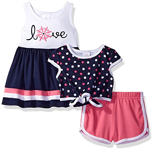 Youngland Baby Girls' 3 Pc Set Dress Polka Dot Pop-Over Top Knit Short Navy/White/Pink 18M [並行輸入品]