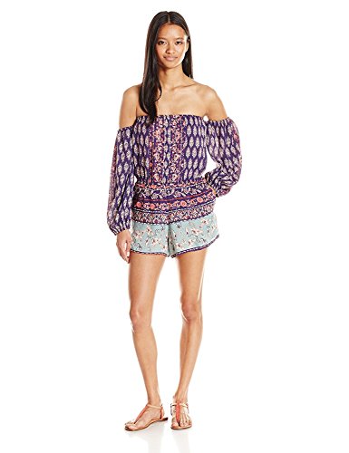 Angie Women's Printed Long Sleeve Off the Shoulder Romper Blue Medium [並行輸入品]