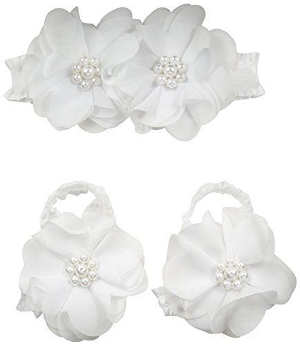 Toby & Company Baby 2 Piece Chiffon Pearl Flower Headband and Barefoot Sandal Set White Newborn Infant Blended [並行輸入品]